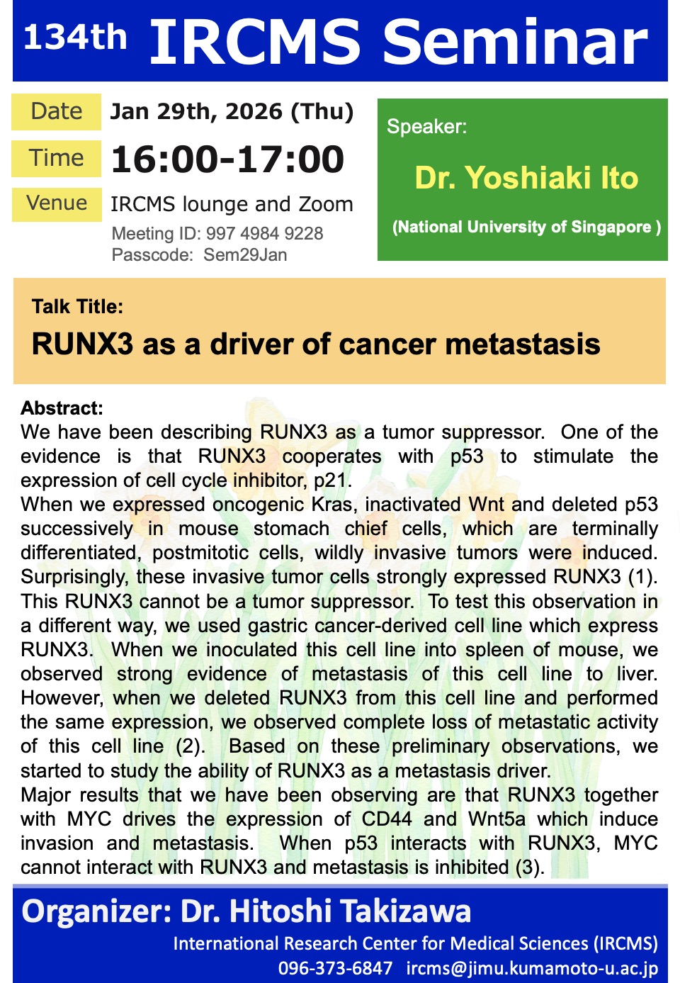 We would like to inform you that the 134th IRCMS seminar has been scheduled as below.