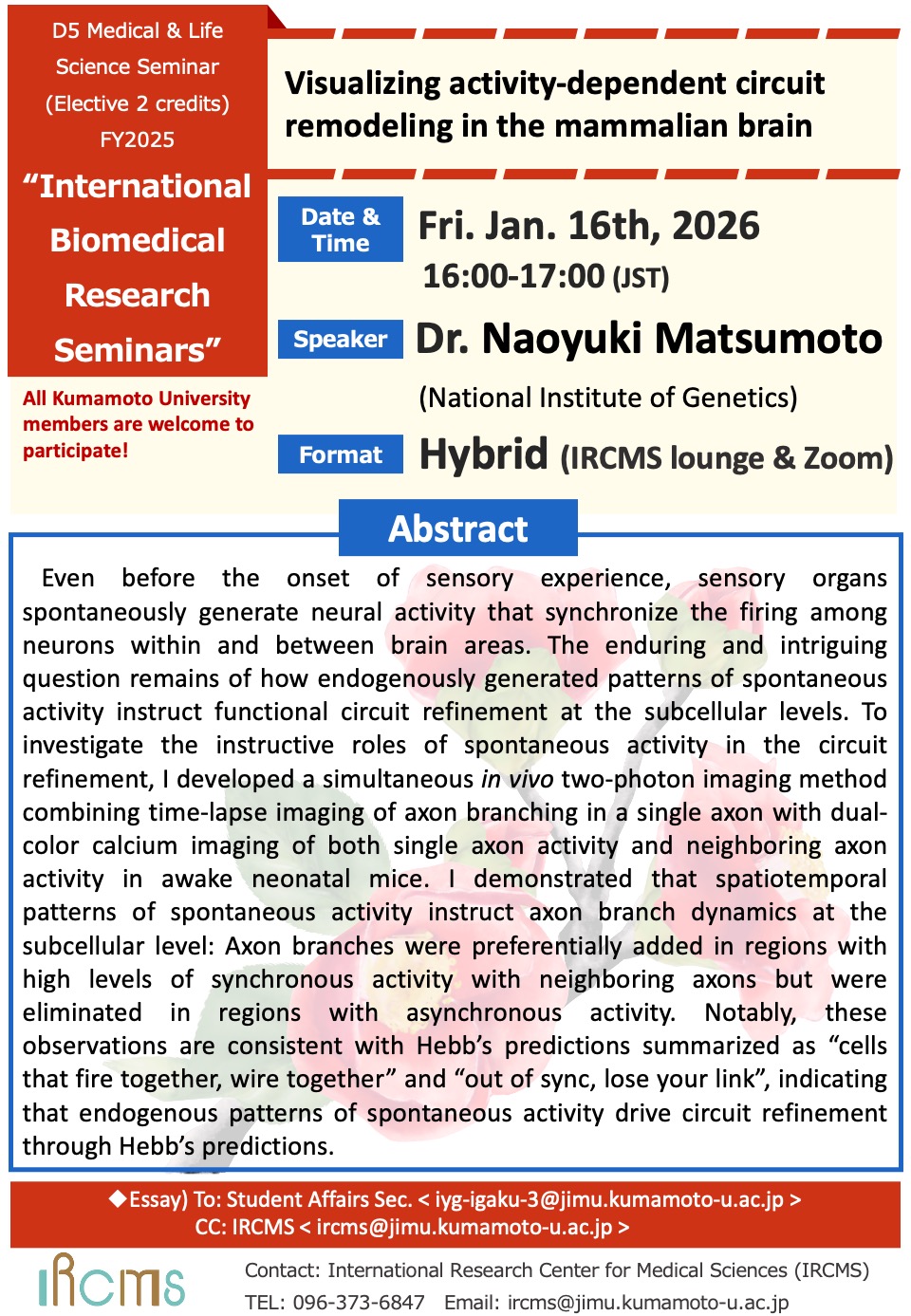 The "D5 Medical & Life Science Seminar" course will be offered by International Research Center for Medical Sciences (IRCMS). It will run from May 2025 to March 2026, with lectures given by scientists who are affiliated with IRCMS or in collaboration with researchers at IRCMS. The lectures will be given once a month, in English, and by leading scientists in the relevant research field. Students will be taught: 1) how normal physiological functions are maintained in the human body; 2) how these systems become abnormal under certain pathophysiologic conditions; 3) why stem cells are important in animal development and homeostasis; 4) how stem cell-based approaches can help us understand disease mechanisms and find potential cure for diseases related to stem cell malfunction (e.g., cancer, aging).