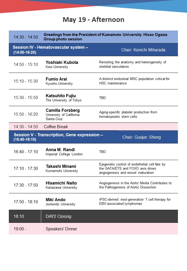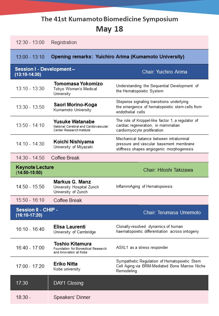 We are honored to announce that we will organize an on-site symposium entitled with the 41st Kumamoto Biomedicine Symposium - Hemovascular system throughout life - as follows. This symposium aims to create a new research field, "Hemovascular Biology," by merging the fields of hematology and vascular biology. We hope to contribute to significant advancements in life sciences research by clarifying how blood and blood vessels interact in health and disease.